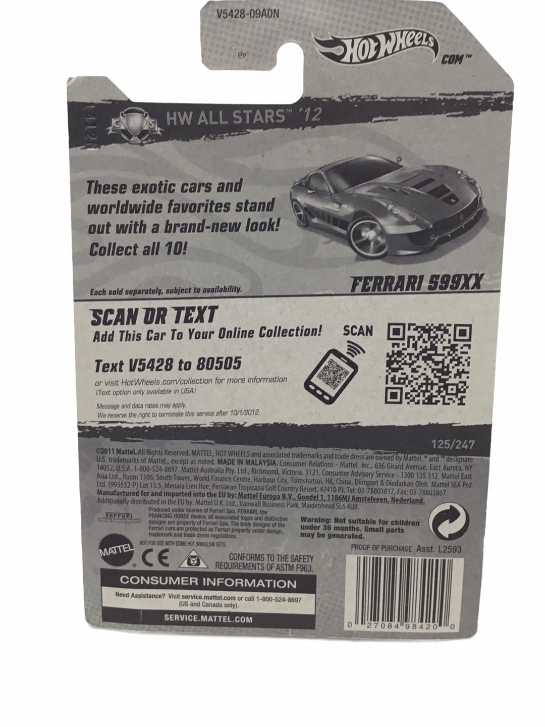 2012 Hot wheels #125 Ferrari 599XX with protector