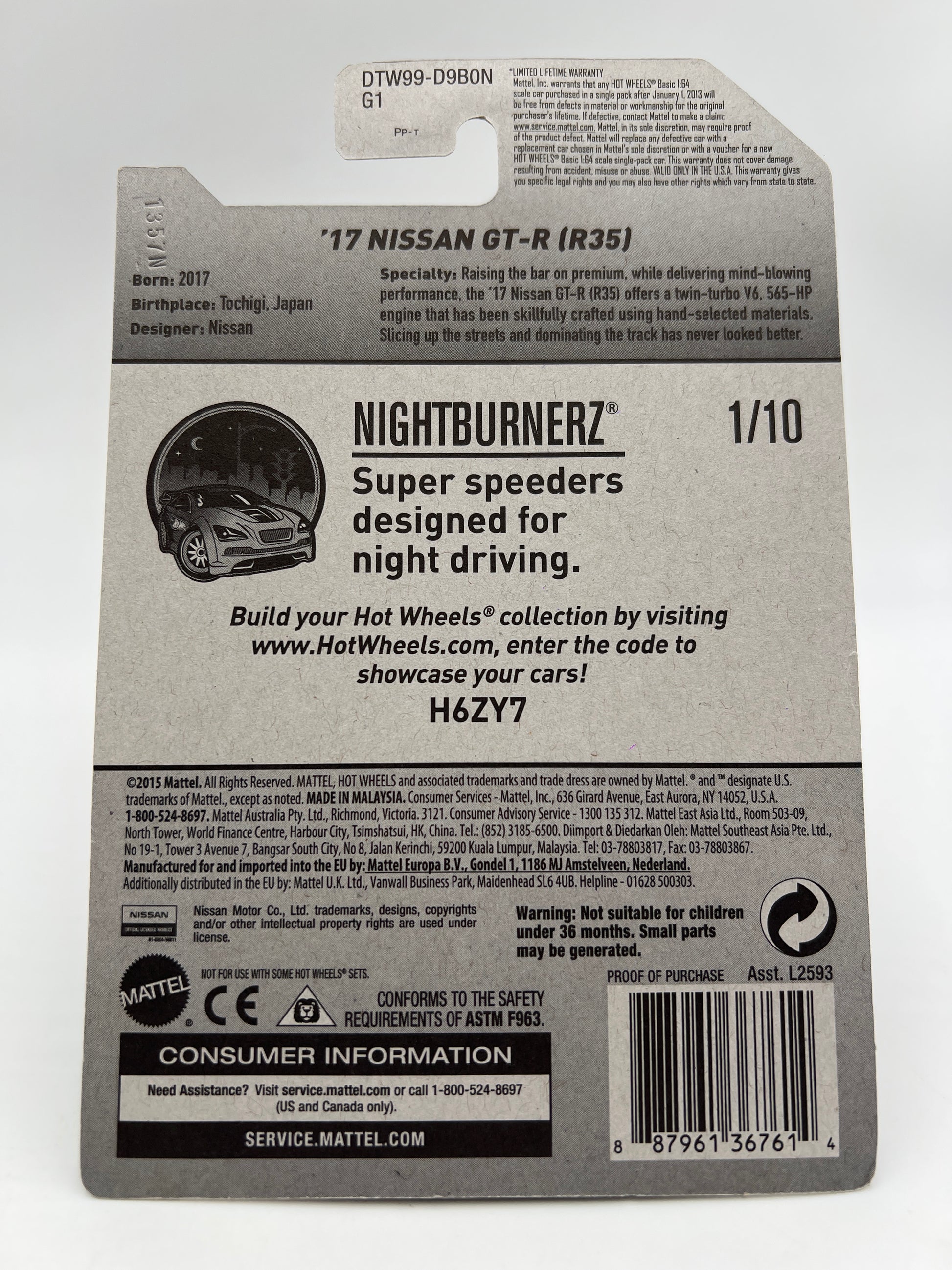 2017 Hot Wheels Factory Sealed Nightburnerz #282 17 Nissan GT-R R35 Orange W/Protector