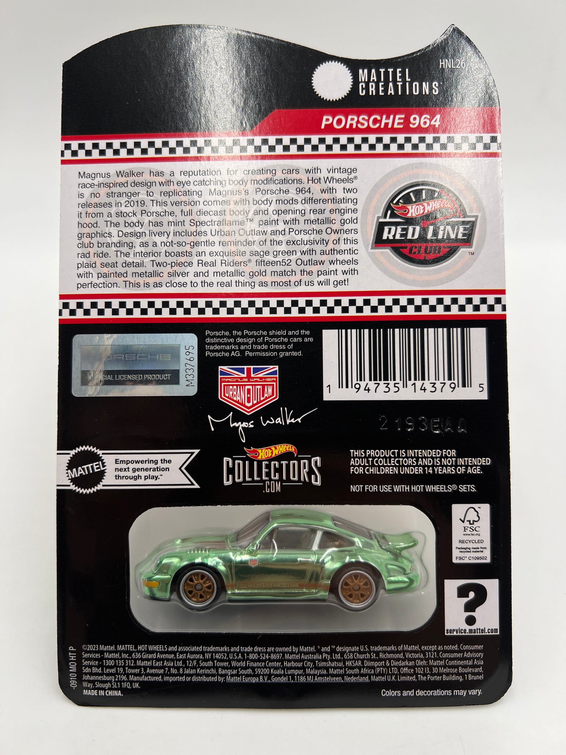 Hot Wheels RLC Porsche 964 Magnus Walker Urban Outlaw Green W/Protector