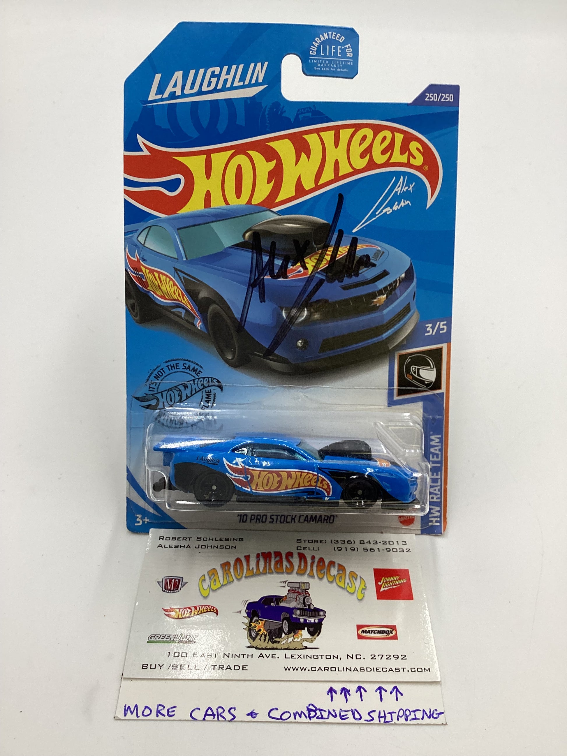 Hot Wheels 10 Pro Stock Camaro Blue #250 Autographed Alex Laughlin Cracked Blister Both Sides with protector